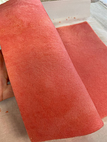 Бисквитный пласт перевернуть рисунком вниз. Намазать его заварным кремом по перемитру. Выложить "полосками" ягодное конфи . Свернуть .Дать время для стабилизации. Отрезать неровные края . Рулет готов.