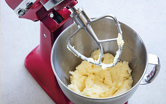 Смешать все ингредиенты (кроме глазури) в миксере с помощью лопатки на средней скорости до получения однородной массы в течение 4-5 минут.