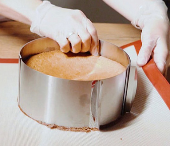Из бисквитного п/фабриката вырезать два коржа. Торт собирается в кольце (диаметр 18 см): Корж, конфитюр, корж. Отправить для стабилизации в холодильник.